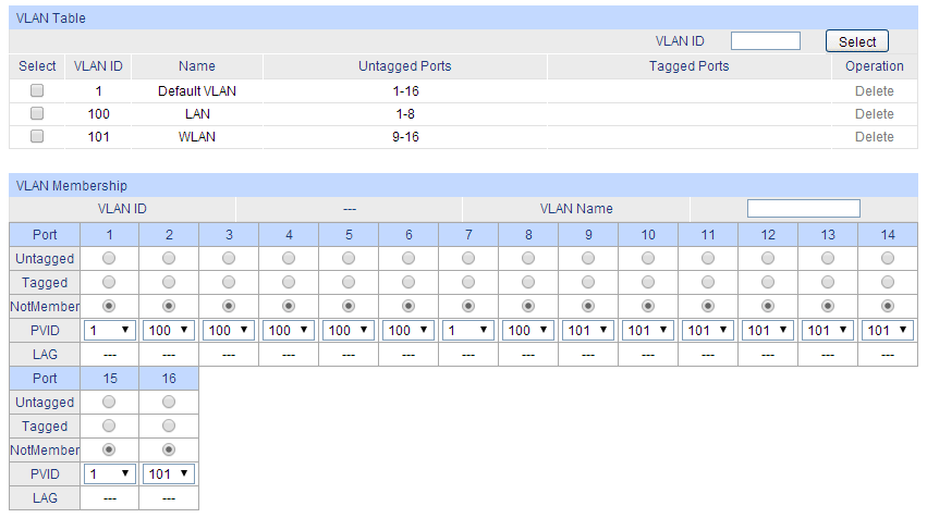 Fortunately, though, there were tutorials online as to how to configure these TP-Link switches to set up VLAN tagging. This one in particular was exactly what I was looking for. I set up VLANs 100 and 101 for my wired and wireless subnets respectively, and determine which ports I would essentially be trunking back to the router. I came up with this config: