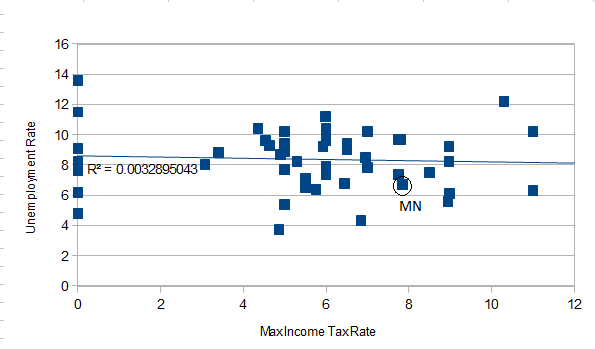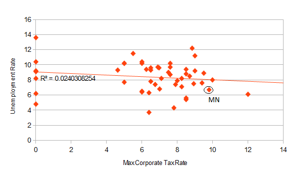 The line is the best fit trend line, and shockingly it shows that higher corporate tax rates seem to result in lower unemployment, although the correlation is almost non-existent. The column of dots on the Y-axis representing all the states with no corporate income tax shows a very wide spread in unemployment rates. Minnesota is actually doing better than the trend line would predict, with a lower unemployment rate than would be assumed from its corporate income tax rate.