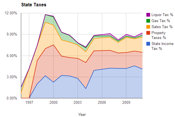 I’ve been tracking my income and expenses in Quicken forever (despite it being terrible software), so I could pretty easily figure out my tax burdens. Income taxes and payroll taxes were easy. Property taxes were difficult due to renting: I used an estimate of 15% of rent towards property taxes, less than the 17% calculated on the Minnesota Property Tax Refund. Sales taxes were also somewhat dicey, as I had to estimate based on various categories of spending. Ditto for the liquor tax, which I included simply because it was easy to do so. Gas tax was also easy: in addition to monitoring my spending, I’ve been monitoring my gas consumption forever too.
